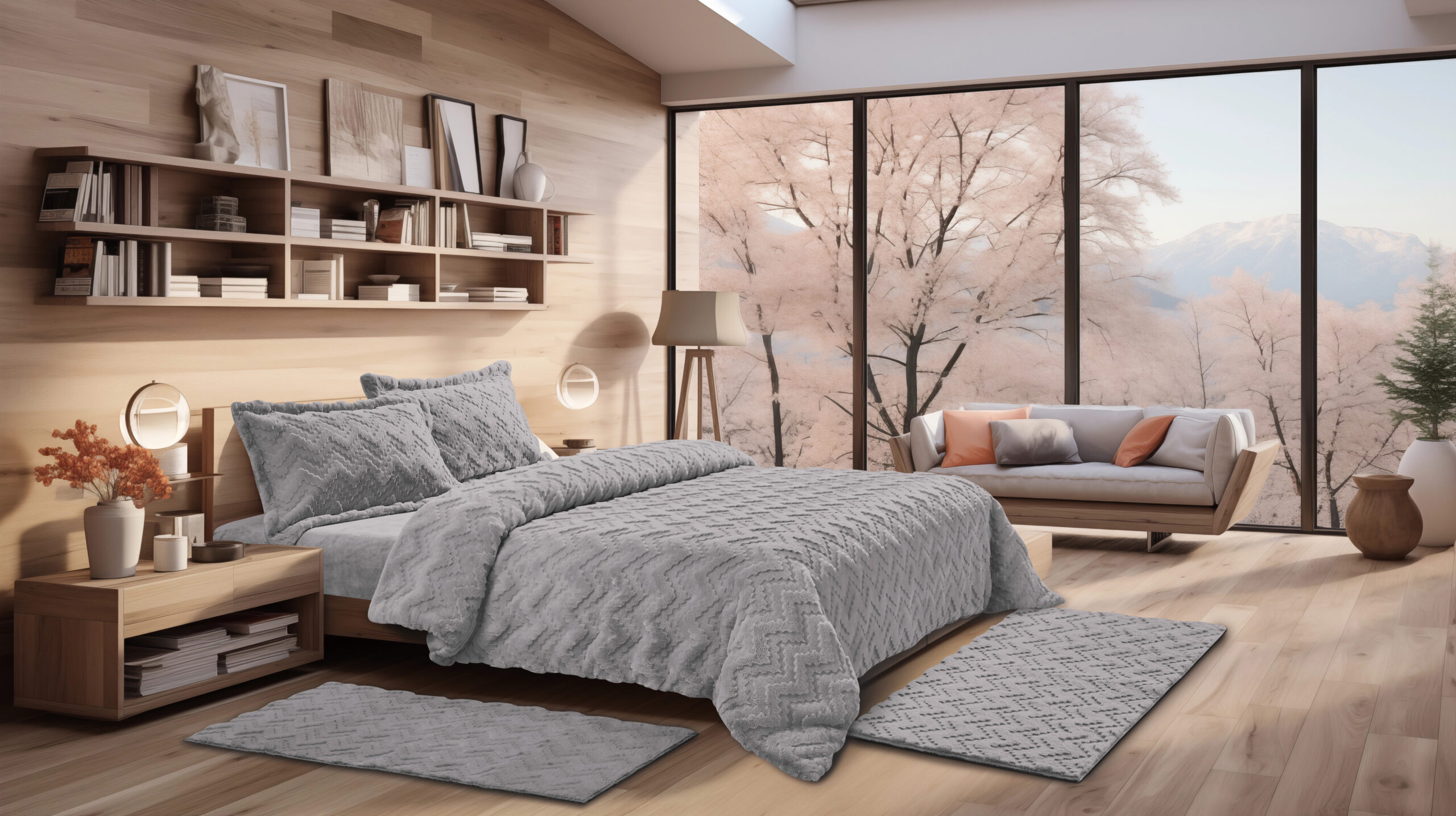 מערכת מצעים חורפית עשירה ויוקרתית בעיצוב מודרני וחדשני. הסט מעוצב בהדפסה ייחודית של צבעים חורפיים על גבי דוגמה עכשווית ומתוחכמת מובלטת בבד. הסט עשוי מבדי דמוי פרווה נעימה רכה ומלטפת בצבעים חמים במיוחד לימי החורף הקרים.